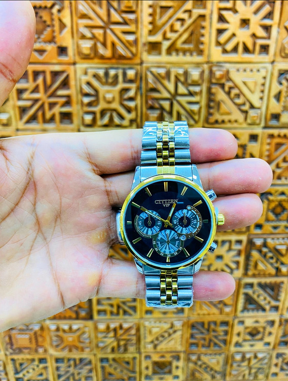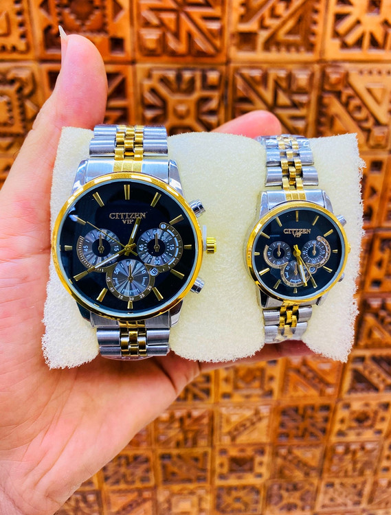 ست ساعت مچی زنانه و مردانه مدل VIP از برند CITIZEN با طراحی بسیار جذاب، ترکیب رنگ طلایی و نقرهای در بند استیل و صفحه مشکی براق، استایلی کاملاً رسمی و متفاوت برای زوجها ایجاد میکند.
