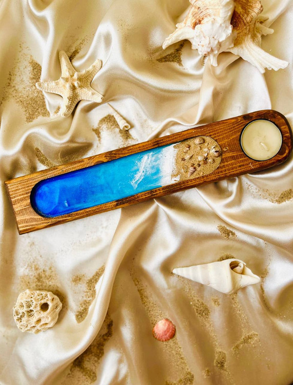 • جنس: از چوب طبیعی با کیفیت بالا ساخته شده و سطح آن با رزین شفاف و رنگی پوشیده شده است که جلوهای شبیه امواج و ساحل ایجاد میکند.